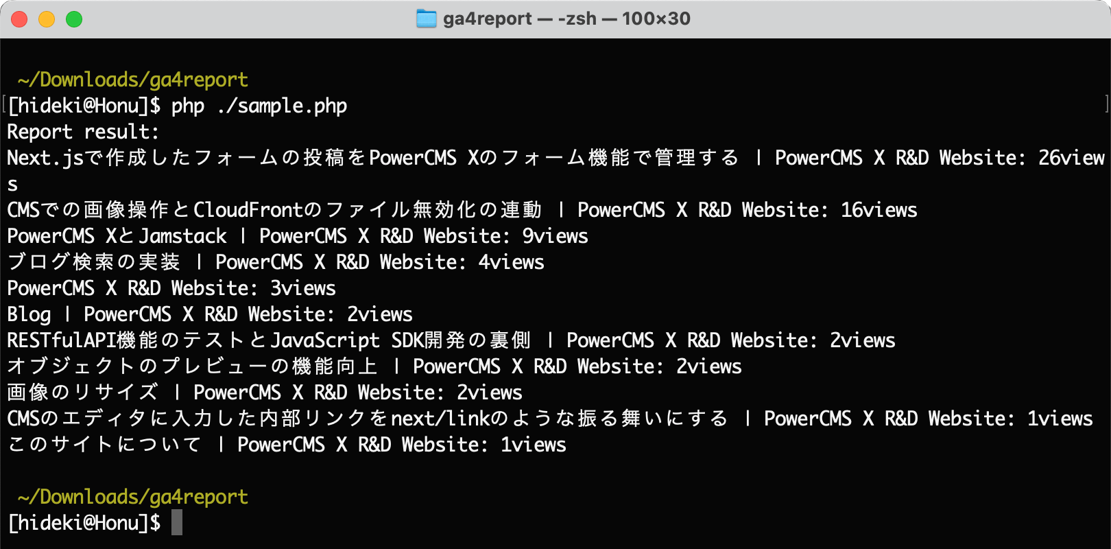 ターミナルでPHPを実行したところ、以下のようにGA4に格納されているページタイトルと表示回数が取得できました。この結果はブラウザでGA4の「ページとスクリーン: ページタイトルとスクリーンクラス」にアクセスして表示される結果と一致していました。